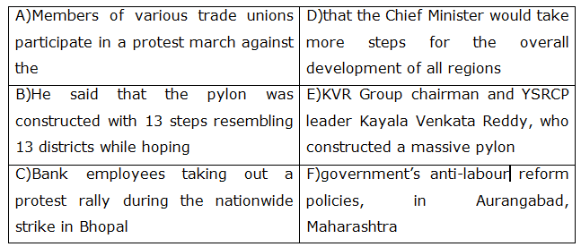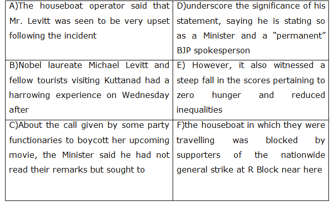 Direction (1-5): In the following questions two columns are given containing three Sentences/phrases each. In first column, sentences/phrases are A, B and C and in the second column the sentences/phrases are D, E and F. A sentence/phrase from the first column may or may not connect with another sentence/phrase from the second column to make a grammatically and contextually correct sentence. Each question has five options, four of which display the sequence(s) in which the sentences/phrases can be joined to form a grammatically and contextually correct sentence. If none of the options given forms a correct sentence after combination, mark (e), i.e. “None of these” as your answer.