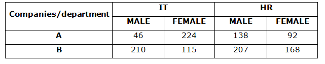 There are 1200 employees in two different companies A and B and each company have two different departments – IT and HR. Total number of employees in company A is 500. 115 IT department employees from company B is female. The number of female employees from company B in HR department is 25% less than the number of female employees from A in IT department and 30 more than number of male employees from company A in HR department. Ratio of the number of male employees from company A in IT department to the number of female employees from A in HR department is 1: 2. Ratio of the number of male employees from B in IT department to the number of female employees from B in HR department is 5: 4. The number of male employees from B in HR department is 207.