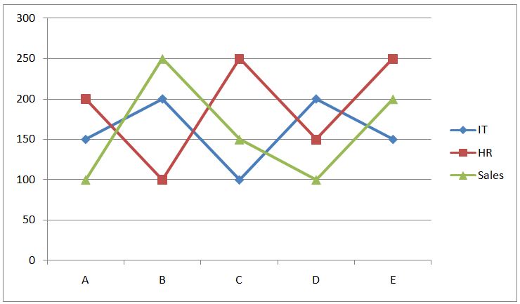 The given line graph shows the number of employees in three different department from five different companies – A, B, C, D and E in 2015.