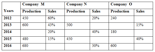 4) Company N has produced 900 lakhs pens in 2016 and the number of pens sold by the same company in 2013 is 10 % more than number of pens sold by the company in 2016, then find number of pens produced by the same company in 2014 if the number of pens sold by company N in 2013 and 2014 is in the ratio of 9 : 8?