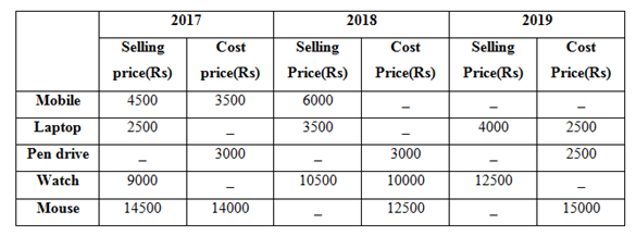 Ratio of the cost price of Laptop and Watch in 2017 is 4: 15 and the profit percentage of Pen drive in 2017 is 16 (2/3) %. Overall profit of all the products in 2017 is 13 (1/3) %. The profit for all the products in 2018 is Rs.6000 and increases by 66.67 % in 2019. Ratio of the cost price of Mobile and Watch in 2019 is 2: 3 and the total cost price in 2019 is Rs.35000.