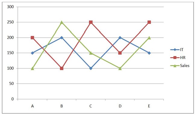 The given line graph shows the number of employees in three different department from five different companies-A, B, C, D and E in 2015.