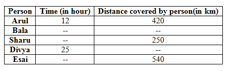 9) If the speed of Bala and Divya in the ratio of 6:7 and the time taken by Arul to cover the distance is 20% more than the time taken by Sharu. Ratio of the time taken by Sharu and Bala is 2:3 and the ratio of the time taken by Bala and Esai is 5:6. If the ratio of the speed of Divya to Arul is 6:5, then what is the average speed of whole journey in all the persons together?