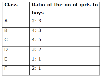 10) What is the ratio of the total boys in class B, C and D together to that of the total girls in class A, E and F?