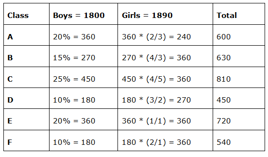 Percentage of boys in class B = 54Ëš * 100/360 = 15%