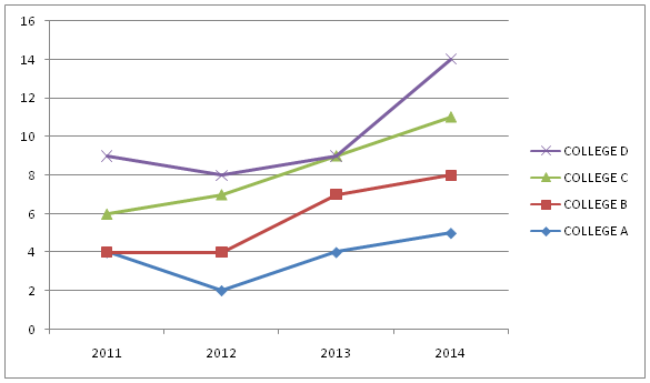 The following line graph represents the number of students in different Engineering colleges A, B, C and D in the year 2011 to 2014. The number of students is in lakh.