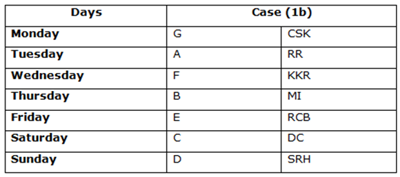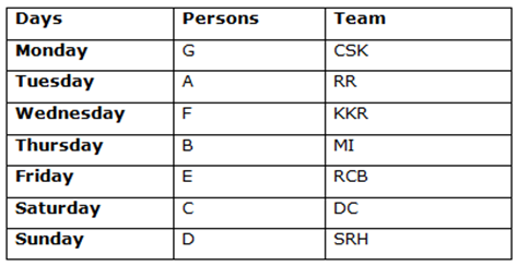 Seven persons A, B, C, D, E, F and G are belongs to seven different teams are CSK, MI, RR, KKR, RCB, DC and SRH are not necessarily in the same order. They had match on seven different days of the week starting from Monday.