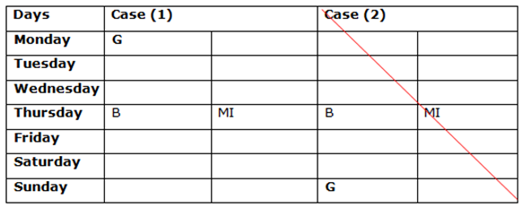 B belongs to MI, and he had a match on Thursday. Only two people had a match between B and G.E had match on immediately before C. G had a match on one of the days before E but not immediate before.