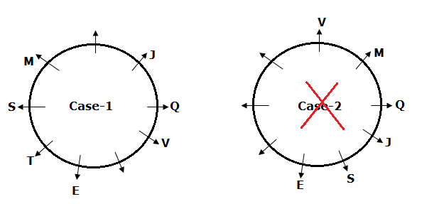 Q sits third to the left of E. J sits second to the right of M and is one of the immediate neighbours of Q. S sits fourth to the right of V, who is not an immediate neighbour of E. T is an immediate neighbour of S. W is not an immediate neighbour of B. At least two persons are sitting between W and M.