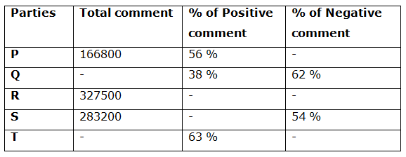 Face book allows their users to post a comment for upcoming general elections. The following table shows the total number of positive comments (in favour), negative comments (against) of 5 different parties in a certain state. Some values are missing here.