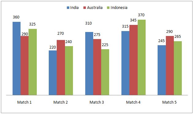 The following line graph shows the runs scored by three different teams in 5 different cricket matches.