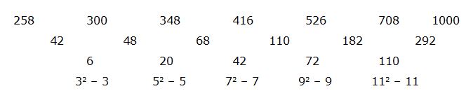 The difference of difference is, (2*3), (4*5), (6*7), (8*9), (10*11)