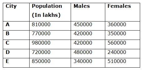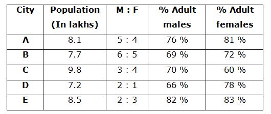 The following table shows the population of different cities (In lakhs) and the ratio of males and females among them and the percentage of adult males and adult females.