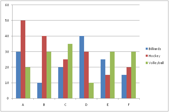 निम्नलिखित बार ग्राफ विभिन्न स्कूलों से अलग-अलग खेल खेलने वाले छात्रों की कुल संख्या को दर्शाता है।