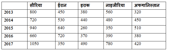 निम्न तालिका 5 अलग-अलग देशों में 5 विभिन्न वर्षों में दर्ज किए गए आतंकवादी हमलों की कुल संख्या को दर्शाती है।