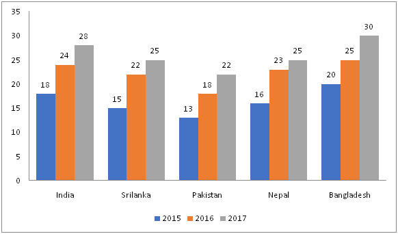 7) 2015 और 2017 में एक साथ श्रीलंका की सकल राष्ट्रीय आय और 2016 और 2017 में एक साथ बांग्लादेश की सकल राष्ट्रीय आय का अनुपात ज्ञात कीजिए?