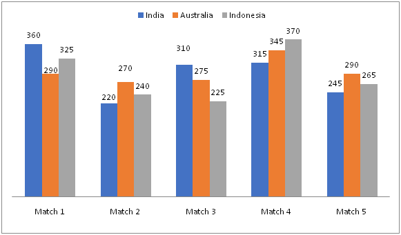 6) मैच 1 और 3 में एक साथ भारत और इंडोनेशिया द्वारा बनाए गए कुल रन, सभी दिए गए मैचों में एक साथ ऑस्ट्रेलिया द्वारा बनाए गए कुल रन से लगभग कितने प्रतिशत कम है?