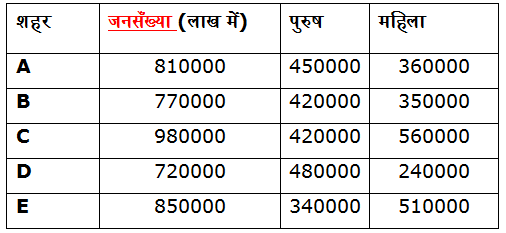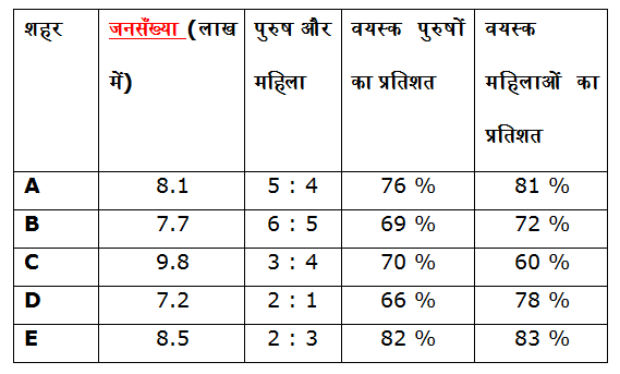 निम्न टेबल विभिन्न शहरों की जनसँख्या (लाख में) और उनके बीच पुरुषों और महिलाओं के अनुपात और वयस्क पुरुषों और वयस्क महिलाओं के प्रतिशत को दर्शाती है।
