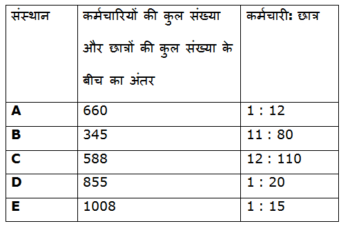 निम्न तालिका विभिन्न इंजीनियरिंग संस्थान के कर्मचारियों की कुल संख्या और छात्रों की कुल संख्या के बीच का अंतर और छात्रों के लिए कर्मचारियों के अनुपात को दर्शाती है।