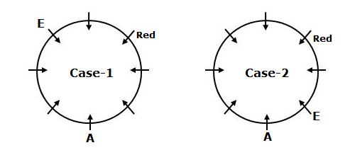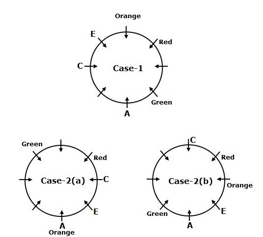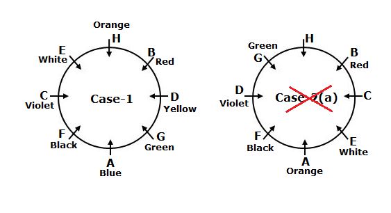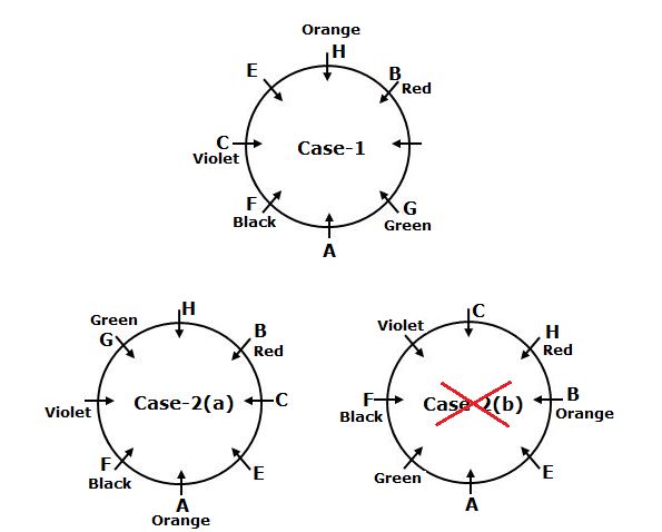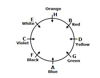 A लाल पसंद करने वाले के बाईं ओर तीसरे स्थान पर बैठा है। केवल एक व्यक्ति E और लाल पसंद करने वाले व्यक्ति के बीच बैठता है। C, नारंगी को पसंद करने वाले व्यक्ति के दाईं ओर दूसरा बैठा है, जो E का तत्काल पड़ोसी है। केवल दो व्यक्ति हरा पसंद करने वाले और नारंगी पसंद करने वाले व्यक्ति के बीच बैठे हैं। जो हरा को पसंद करता है, वह C का निकटतम पड़ोसी नहीं है। B, F के विपरीत बैठता है, जो काला पसंद करता है। H, बैंगनी को पसंद करने वाले के बाईं ओर दूसरे स्थान पर बैठता है। H को हरा पसंद नहीं है। E और काले रंग को पसंद करने वाले व्यक्ति के बीच बैठे लोगों की संख्या लाल को पसंद करने वाले और G के बीच बैठे लोगों की संख्या समान है| E को न तो पीले न ही नीले रंग पसंद हैं। A को नारंगी और पीला पसंद नहीं है।