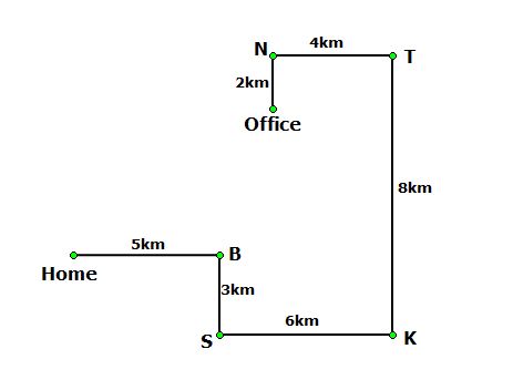 अरुण अपने घर से शुरू करके बाइक से अपने कार्यालय जाता है। वह बिंदु B तक पहुंचने के लिए पूर्व में अपने घर से 5 किमी तक जाता है। फिर, अपने दाएं मुड़ता है और बिंदु S तक पहुंचने के लिए 3 किमी की दूरी पर जाता है। बिंदु S से, वह अपनी बाईं ओर मुड़ता है, बिंदु K तक पहुंचने के लिए 6 किमी के लिए जाता है। उस बिंदु से वह उत्तर की ओर 8 किमी जाता है और बिंदु T पर पहुँचता है, बिंदु T से वह बाएँ मुड़ता है और बिंदु N तक पहुँचने के लिए 4 किमी जाता है। वह बिंदु N से अपने कार्यालय तक पहुँचने के लिए दक्षिण की ओर 2 किमी जाता है।