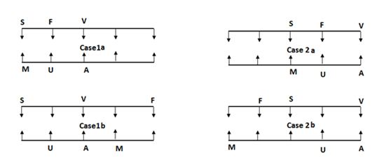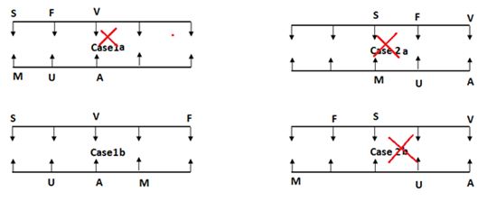•  A, वह जिसका मुख S की ओर है,के दाईं ओर से दूसरे स्थान पर बैठता है। यहां हम स्थिति 1 में चरम बाईं छोर पर S की स्थिति को निश्चित नहीं कर सकते। क्योंकि यदि हम S को निश्चित करते हैं फिर हम A की स्थिति को निश्चित नहीं कर सकते हैं। इसीलिए S स्थिति 1 में चरम दाईं छोर पर बैठता है।