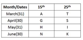आठ व्यक्ति A, K, N, H, G, S, T और I का जन्म चार अलग-अलग माह अर्थात मार्च, अप्रैल, मई और जून में दो अलग-अलग तिथियों 15 और 25 तारीख को हुआ था लेकिन आवश्यक नहीं कि इसी क्रम में हो।