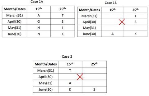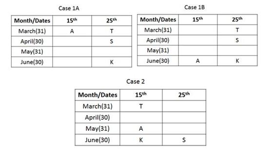 S का जन्म उस महीने जिसमें 31 दिन नहीं हैं,की 25 तारीख को हुआ था। S और A के बीच दो व्यक्ति पैदा हुए थे। T और K के बीच पाँच व्यक्तियों का जन्म हुआ। K का जन्म मार्च को नहीं हुआ था। I के बाद जन्म लेने वाले व्यक्ति की संख्या G के पहले पैदा हुए व्यक्ति की संख्या के समान है। N का जन्म I के तत्काल बाद हुआ था। I और H  एक ही महीने में पैदा हुए थे।