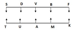 दस व्यक्ति S, D, U, M, A, K, T, B, V और F दो समानान्तर पंक्ति – पंक्ति 1 और पंक्ति 2 में एक-दूसरे की ओर मुख करके बैठे हैं। S, F, B, V और D पंक्ति 1 में दक्षिण की ओर मुख करके बैठे हैं और T, K, U, M और A पंक्ति 2 में उत्तर की ओर मुख करके बैठे हैं लेकिन आवश्यक नहीं कि इसी क्रम में हों।