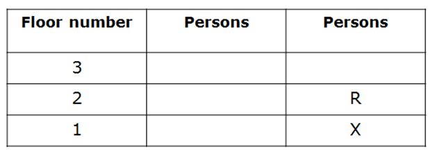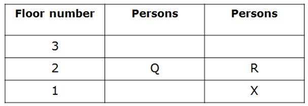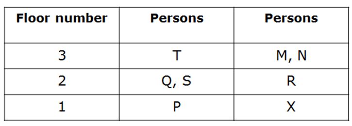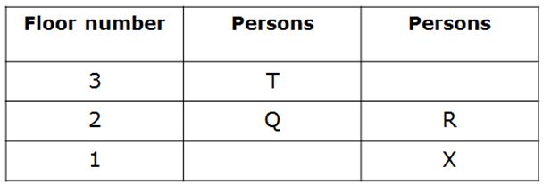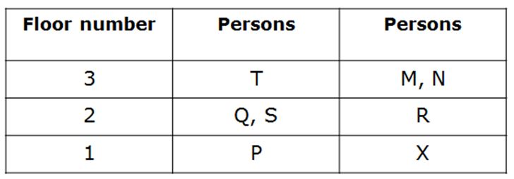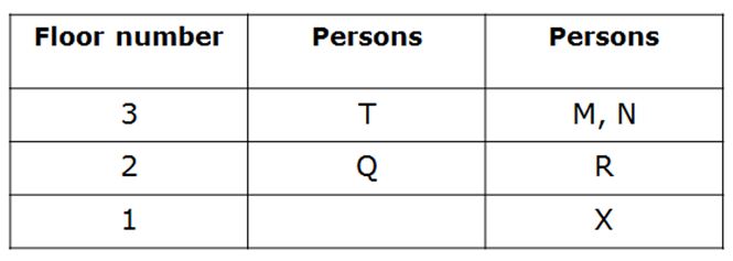 R, X के तत्काल ऊपर रहता है। दूसरी और तीसरी दोनों मंजिल पर तीन व्यक्ति रहते हैं। R एक कमरे में रहता है जो Q के कमरे के दाईं ओर है। Q, T के तत्काल नीचे रहता है। M और N एक ही कमरे में रहते हैं। P का कमरा S के कमरे के तत्काल नीचे है, जिसमें दो व्यक्ति रहते हैं। X की मंजिल में केवल दो व्यक्ति रहते हैं। X बाईं ओर के कमरों में नहीं रहता है।