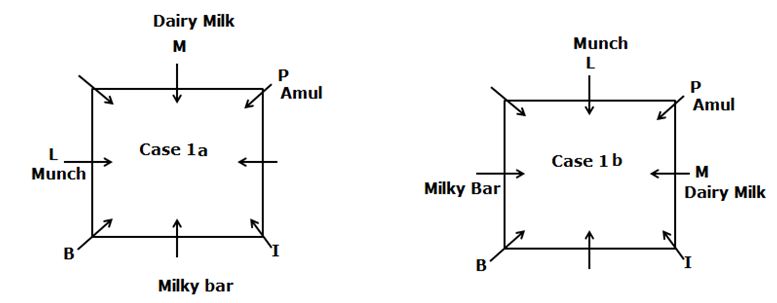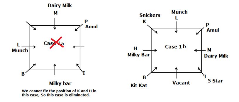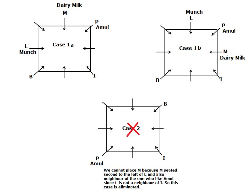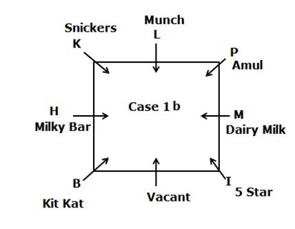 I किसी भी भुजाओं पर नहीं बैठता और वह किट कैट को पसंद नहीं करता है। B किसी भी भुजाओं पर नहीं बैठता है, बल्कि P जो अमूल को पसंद करता है, के विपरीत बैठता है। L मंच को पसंद करता है और मेज़ के कोने पर नहीं बैठता है। L, I का पड़ोसी नहीं है। M को डेरीमिल्क पसंद है और L के बाईं ओर दूसरे स्थान पर बैठता है।वह जो अमूल को पसंद करता है,M का तत्काल पड़ोसी है। वह जो मिल्की बार को पसंद करता हैं और वह जो डेयरी मिल्क को पसंद करता हैं, का मुख एक-दूसरे की ओर है। K, H के तत्काल बाईं ओर बैठा है।स्निकर्स पसंद करने वाले के पड़ोस में खाली सीट नहीं है।
