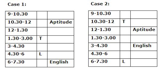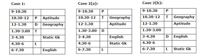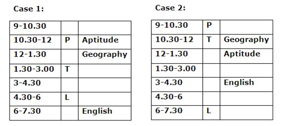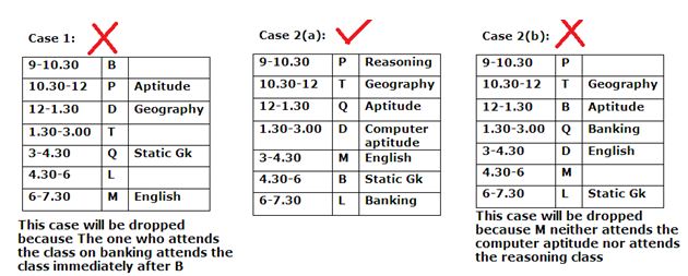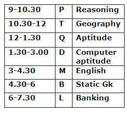 कंप्यूटर एप्टीट्यूड क्लास पहले निर्धारित नहीं थी। L शाम 4 बजे के बाद क्लास में शामिल होता है। दो व्यक्ति T और एक जो अंग्रेजी क्लास में भाग लेता है के बीच की क्लास में भाग लेते हैं। सुबह 9.30 बजे से पहले T क्लास में शामिल नहीं होता है। L अंग्रेजी क्लास में शामिल नहीं होता है। T एप्टीट्यूड क्लास में शामिल नहीं होता है। P दोपहर 1 बजे से पहले क्लास में भाग शामिल होता है। P, भूगोल की क्लास में शामिल होने वाले व्यक्ति से ठीक पहले क्लास में उपस्थित होता है। L और जो एप्टिट्यूड पर क्लास में शामिल होता है के बीच तीन व्यक्ति शामिल होते हैं। केवल एक व्यक्ति D और जो स्टैटिक जीके की क्लास में शामिल होता हैं के बीच क्लास जाता है। T, अंग्रेजी की क्लास में जाने वाले से पहले क्लास जाता है। D जो स्टैटिक GK पर क्लास जाता है, से पहले क्लास को जाता है। केवल एक व्यक्ति Q और M के बीच क्लास में भाग लेता है। M, Q के बाद क्लास में शामिल होता है। जो व्यक्ति बैंकिंग की क्लास में भाग लेता है, वह B के तत्काल बाद क्लास में उपस्थित होता है, M न तो कंप्यूटर एप्टीट्यूड में भाग लेता है और न ही रीजनिंग क्लास में भाग है।