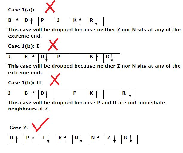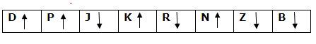 आठ व्यक्ति P, K, J, D, N, Z, B और R एक पंक्ति में बैठे हैं लेकिन जरूरी नहीं कि वे उसी क्रम में हों। उनमें से कुछ उत्तर की ओर और कुछ दक्षिण की ओर का सामना कर रहे हैं।