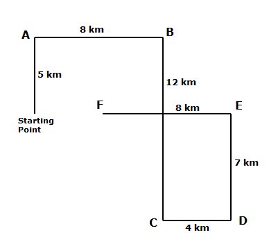 अरुण बिंदु A तक पहुँचने के लिए 5 किमी तक उत्तर की ओर चलना शुरू कर देता है। वहाँ से उसने दायाँ मोड़ लिया और बिंदु B तक पहुँचने के लिए 8 किमी तक पैदल चलता है। उसके बाद उसने दायाँ मोड़ लिया और बिंदु C तक पहुँचने के लिए 12 किमी पैदल चला, जो कि 4 किमी बिंदु D के पश्चिम में है| बिंदु D से, अरुण बिंदु E पर पहुंचने के लिए 7 किमी तक उत्तर की ओर चलता है। अंत में उसने बाएं मुड़ लिया और बिंदु F तक पहुंचने के लिए 8 किमी तक चलता है।