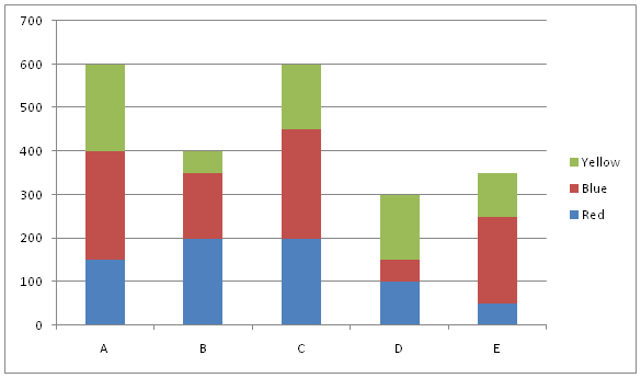 The given bar graph shows the number of employees like three different colors-Red, Blue and Yellow from five different companies-A, B, C, D and E.