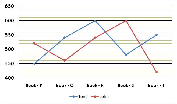 The following line graph represents number of five different books sold by two shopkeepers in the month of March.