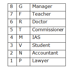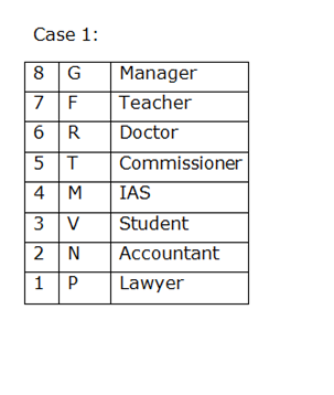 आठ व्यक्ति F, G, P, R, M, N, V और T आठ अलग-अलग मंजिलों में रहते हैं। सबसे निचले मंजिल 1 क्रमांकित है, उसके ऊपर मंजिल 2 क्रमांकित है, और इसी तरह से बाकी भी । शीर्ष के मंजिल 8 के रूप में क्रमांकित है। उनमें से प्रत्येक अलग पेशे में है। उनके पेशे वकील, शिक्षक, आईएएस, छात्र, डॉक्टर, अकाउंटेंट, आयुक्त और प्रबंधक हैं। उपरोक्त सभी जानकारी इसी क्रम में होना आवश्यक नहीं है।