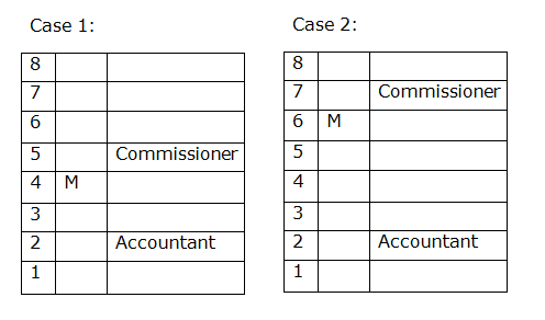 M सम संख्या वाली मंजिल पर रहता है। जो आयुक्त है वह M के ठीक ऊपर रहता है। जो अकाउंटेंट है वह दूसरी मंजिल पर रहता है। M एक अकाउंटेंट नहीं है।