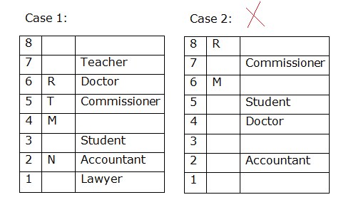 केस 2 को हटा दिया जाएगा क्योंकि केवल एक व्यक्ति T और एक शिक्षक के बीच रहता है। जो एक वकील है वह N के ठीक नीचे रहता है। N के नीचे रहने वाले व्यक्तियों की संख्या एक शिक्षक के ऊपर रहने वाले व्यक्तियों की संख्या के समान है।