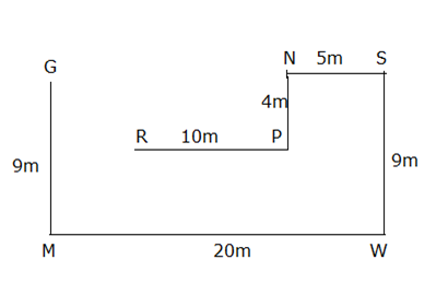 बिंदु R, बिंदु P के 10 मीटर पश्चिम में स्थित है। बिंदु N, बिंदु P से 4 मीटर उत्तर में स्थित है। बिंदु S, बिंदु N से 5 मीटर पूर्व में स्थित है। बिंदु W, बिंदु S से 9 मीटर दक्षिण में स्थित है। बिंदु M, बिंदु W से 20 मीटर पश्चिम में स्थित है। बिंदु G, बिंदु M से 9 मीटर उत्तर में स्थित है।