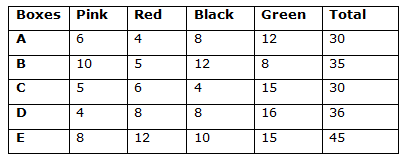 5) If 50% of the balls from Box A, 20% of the balls from Box E and 2/9th of the balls from Box D drawn out and put into Box X. Find the ratio of the pink, red and blue colour balls in box X (Box X contains only three colour balls pink, red and blue)