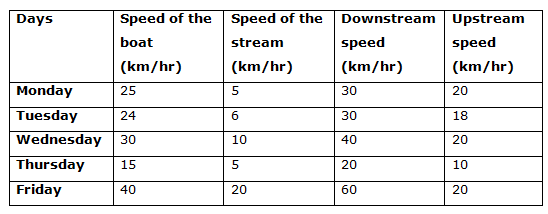 Directions (6 – 10): Following is the information about the upstream speed and downstream speeds of a boat on different days of a week.