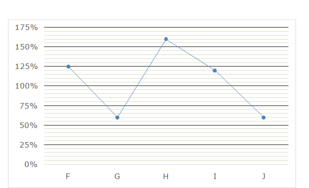 Line graph shows the amount of Diesel as a per cent of amount of petrol. Let consider amount of petrol in last 5 mixtures F, G, H, I and J is 100 each.