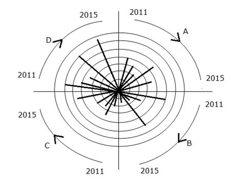 नीचे दिया गया आंकड़ा वर्ष 2011 – 2015 में चार कंपनियों A, B, C और D द्वारा निर्मित कारों की संख्या को दर्शाता है अंतरतम वृत्त 1000 कारों को दर्शाता है; अगला वृत्त 2000 कारों का प्रतिनिधित्व करता है, और इसी तरह। प्रत्येक एक विशेष निर्माण का प्रतिनिधित्व करता है और प्रत्येक चतुर्थांश में पांच पंक्तियों को वर्ष 2011 – 2015 में दक्षिणावर्त क्रम में लिखा जाता है।
