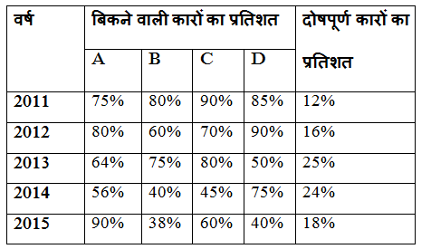 तालिका चार कंपनियों A, B, C और D में बेची गई कारों का प्रतिशत और सभी दी गई कंपनियों के लिए दोषपूर्ण कारों का प्रतिशत दर्शाती है।