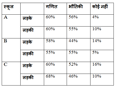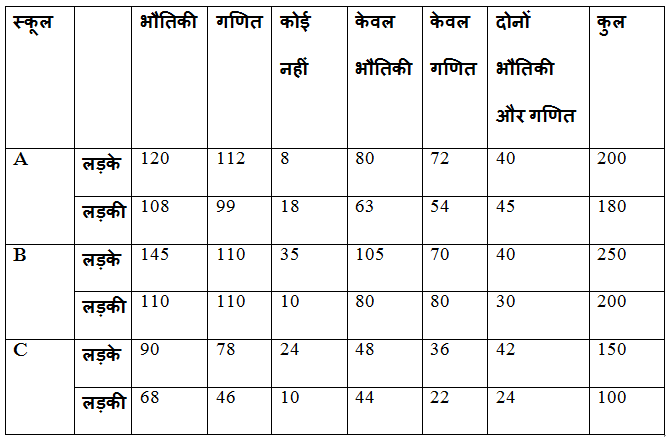 निम्नलिखित तालिका तीन स्कूलों A, B और C में लड़कों और लड़कियों की संख्या के वितरण दिखाती हैं जो गणित, भौतिकी या कोई नहीं पसंद करती है।