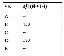 10) यदि सभी कार द्वारा तय की गयी कुल दूरी 1350 किमी है और कार A, कार C और कार E द्वारा तय की गयी दूरी 2: 3: 1 के अनुपात में है। सभी कारों की औसत गति एक साथ कितनी है?