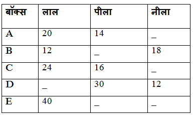 दी गई तालिका से पता चलता है कि पांच अलग-अलग बक्से में तीन अलग-अलग रंग की गेंदें हैं।