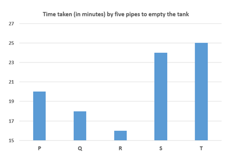 बार ग्राफ 2 टैंक को खाली करने के लिए पांच पाइप (P, Q, R, S और T) द्वारा लिया गया समय दिखाता है