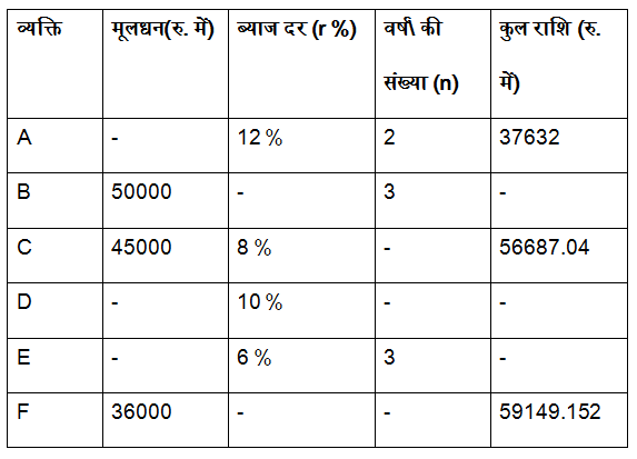 निम्न तालिका में 6 अलग-अलग व्यक्तियों के प्रारंभिक निवेश को दिखाया गया है और उन्होंने अपने निवेश के लिए चक्रवृद्धि ब्याज और ब्याज की दर का उपयोग करते हुए कुल राशि प्राप्त की और वर्षों की संख्या भी दी गयी है। यहां कुछ मान लुप्त हैं।